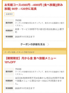↑「店名 クーポン」で調べます。これだけで数百円の節約になります。
