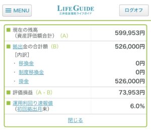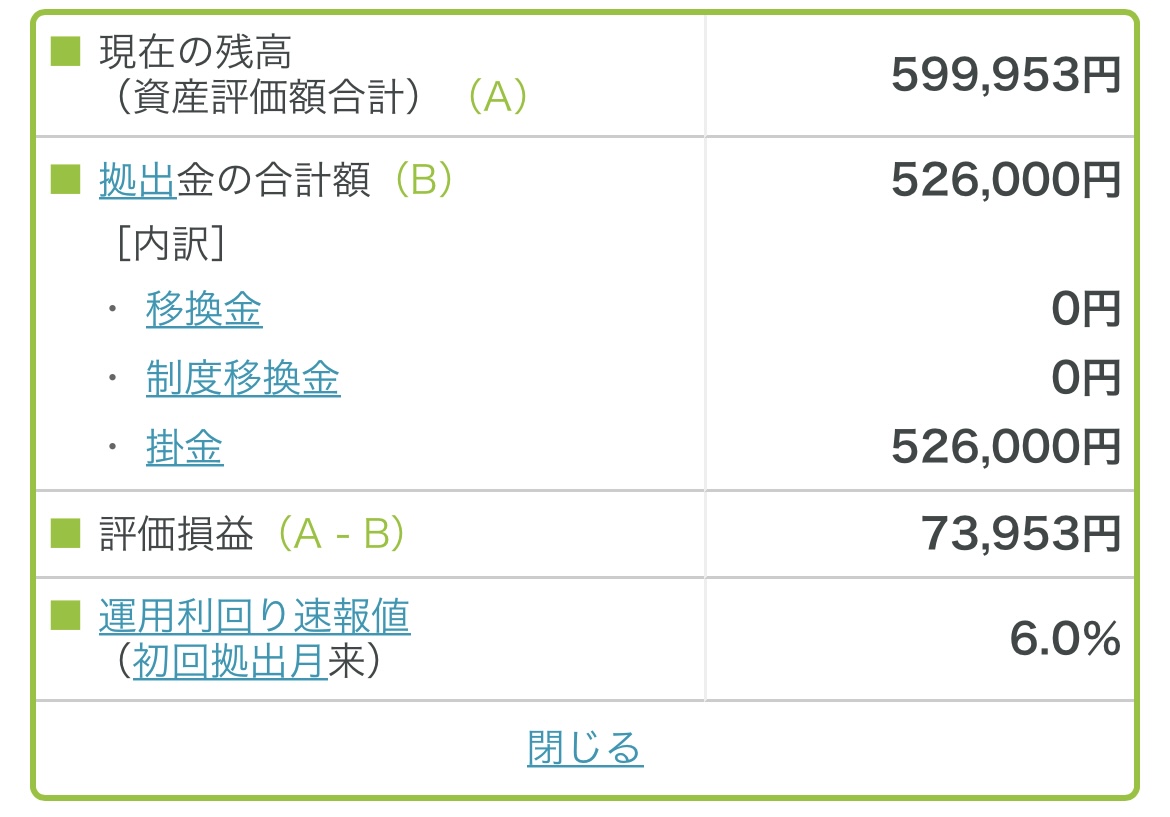 これまでの拠出額が526,000円で、現在の評価額が599,953円なので、73,953円(6.0%)のプラスです。