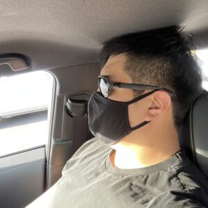 車が小さすぎて(僕がデカすぎて?)後部座席の窓から外を見ています😇